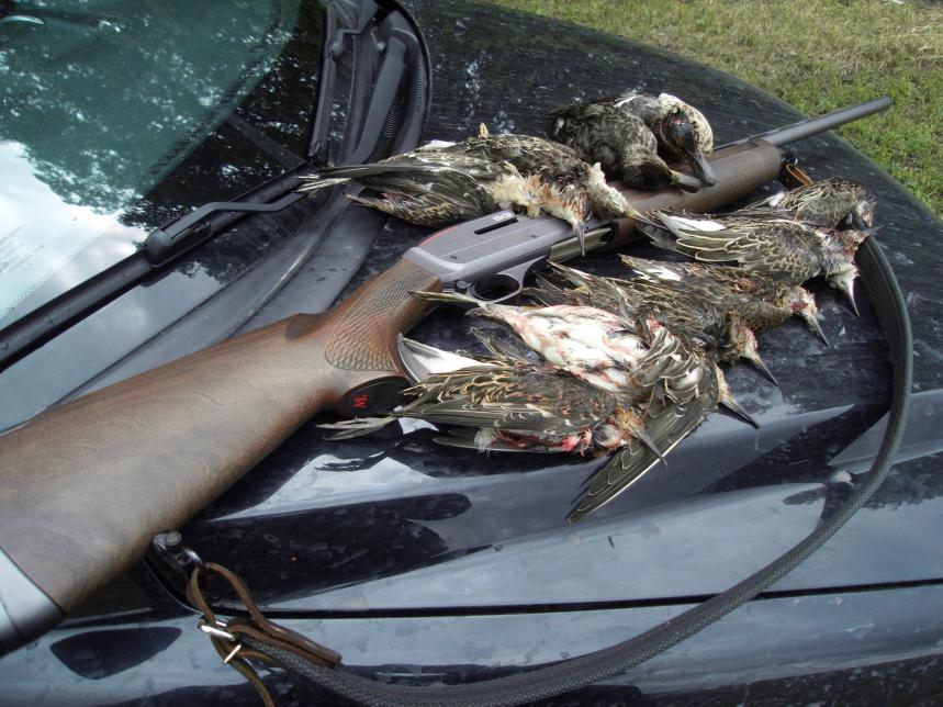 Уехали в пятницу на вечерку,правда там заезжали еще в четверг, и с подхода подняли голов 50 утей ( в четверг правда побольше было раз так в восемь), но утка оказалась хитрее - пропустила и взлетела из-за спины. Все промахнулись. Лет был так себе - охотников мало никто не гонял. По утру в субботу лет был получше, да и погода просто класс. В итоге в пятницу крякаш и чирок, а в субботу крякаш и два чирка. Господа по последним охотам сделал вывод - утка сидит в камыше до последнего, так что топтать ее надо.Ей в такую погоду летать не айс. В посадках белянок просто горы, при желании набрать ведро раз плюнуть. У чирков в желудках не просо было а просянка.