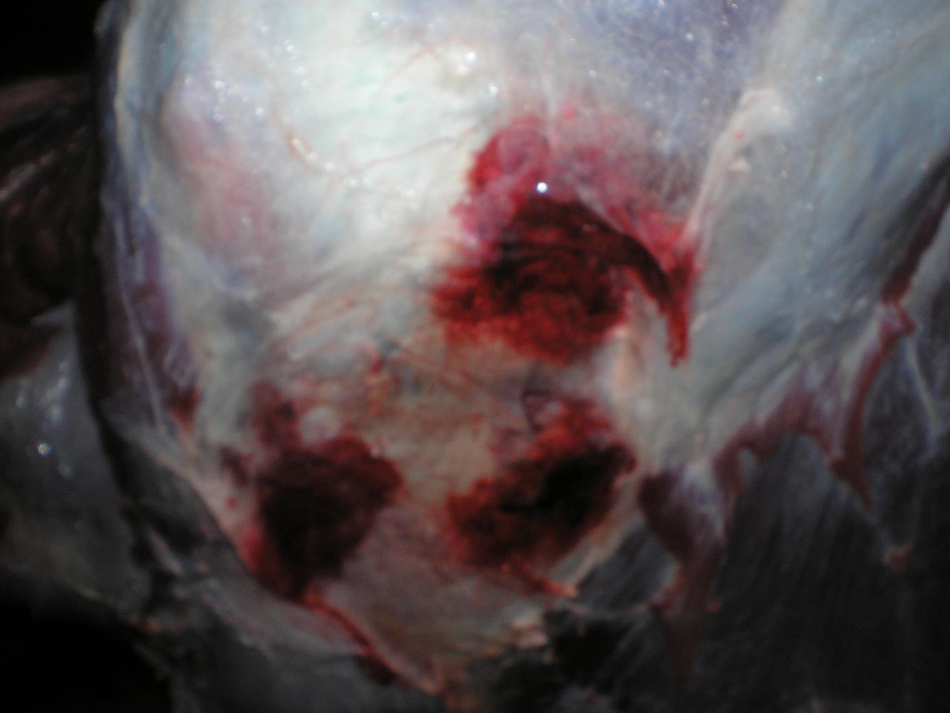 Попадание в левую лопатку. Пуля пробила животное насквозь разделившись на 3 части, на фото видны выходные отверстия. |