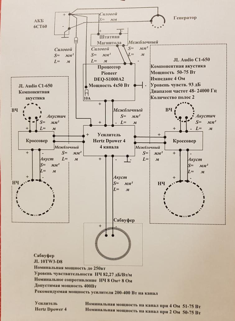 ![]() , требуется консультация по автозвуку. Прошу совета или рекомендованный контакт спеца по автозвуку. Для исключения флуда в теме желательно ответить в ватсап/вайбер (89272002382). Коротко о главном . На последних 5 машинах автозвук ставила одна и та же фирма, она же делала и шумку. На предыдущих машинах был обычный комплект магнитола, фронтальная и тыловая акустика , встроенный саб в багажнике. Вопросов нет-система работает исправно. Могут подтвердить покупатели моих шевиков, музыку всегда оставлял в продаваемой машине(есть наши форумчане). На последней машине в эту схему внесены изменения: штатная магнитола и цифровой процессор. После покупки Шевика загнал машину и сделал музыку, кроме саба. Подумал, что хорошей фронтальной компонентной акустики на старости лет мне хватит, но попросил на всякий случай в багажник кинуть акустический кабель для саба. Вроде все нормально, под себя настроил эквалайзер,.....но чудес не бывает, не ласкает ухо качественный звук . Решил поставить, рекомендованный тогда, сабвуфер , но смутил вид проводов , выведенных в багажник, площадь сечения как бы маловата . Прежде чем ехать в салон решил для себя вникнуть в эту тему более конкретно. Посидел маленько прикинул схему, не спец, возможно много косяков , ну да ладно...Теперь вопросы: - рекомендации по сечению силовых, межблочных и акустических кабелей (примерно, т.к. длины сейчас указать в схеме не могу) - правильно ли рекомендован сабвуфер ( вроде как по характеристикам усилитель слабоват или я что-то не учел?) ну фото , как обычно устраивается саб в багажнике