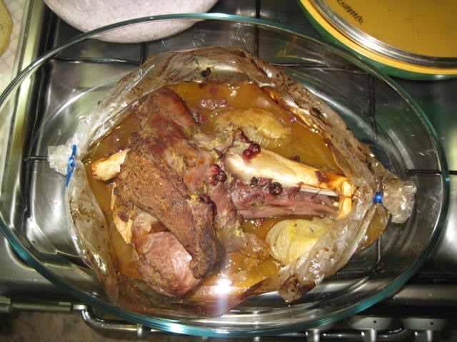 Мясо обжариваем на сале минут 10-15 до золотистого цвета, добавляем крупно резанную морковь и 3-5 штук ягод можжевельника, через 25 минут резанный лук, через 10 минут средне нарезанный без кожи и середины 3 кислых зеленых яблока, через 15 минут почишенный и крупно нарезанная головка чеснока, через 10 минут четверть без шкуры нарезанный лимон и чуть соли, через 10 минут выключаем и через 5 минут на тарелку!!!! Всей семье понравилось.