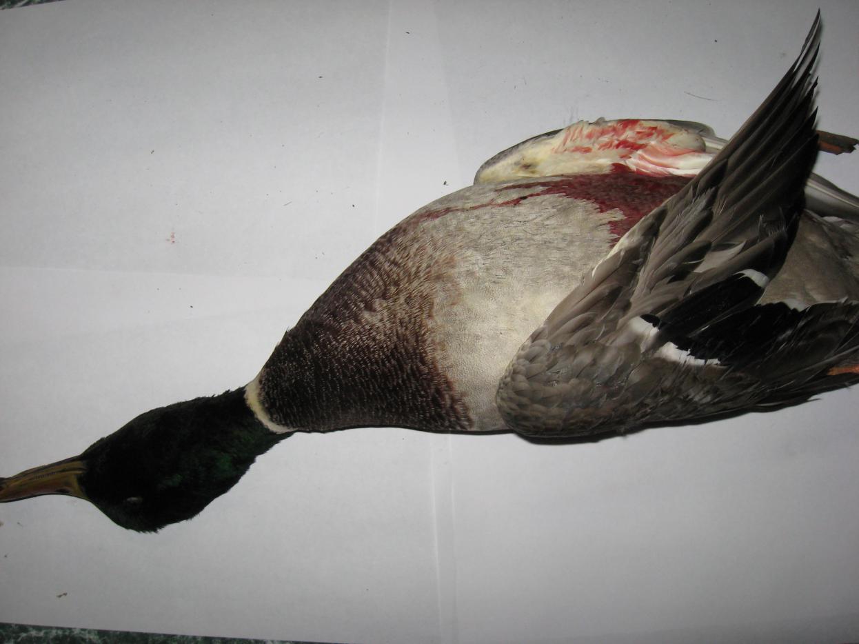 вылетел этот дружок (как говорит Igoreha - зеленоголовый упырь ) из-за деревьев со стороны спины, пришлось стрелять в него на расстоянии примерно 10 метров полумагнумом из чока, в результате пол тушки насквозь дробью, вот такая охота. Кстати стрелял еще в этот же момент в трех уток, но расстояние было слишком мало для чока, так что в остальных промахнулсиии....