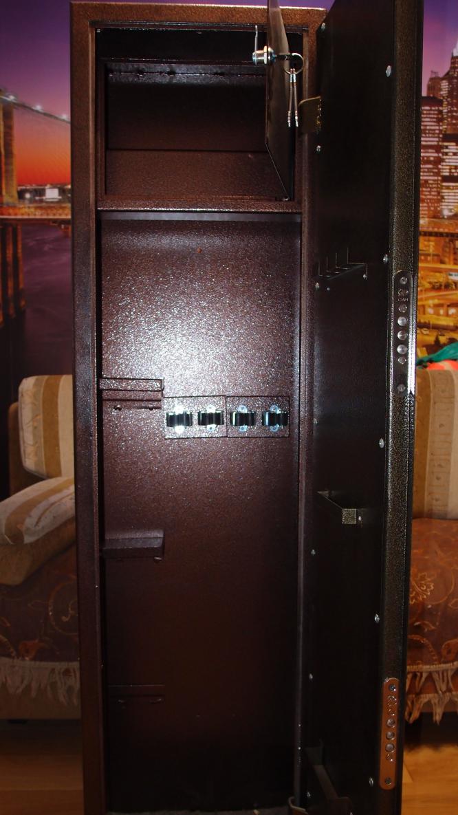 отвечу я, так как владею таким же сейфом. мр-153 со стволом 710 помещается в собранном виде без проблем.