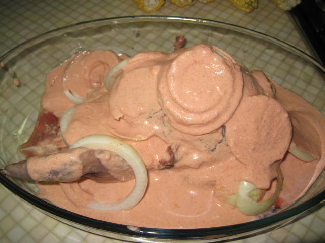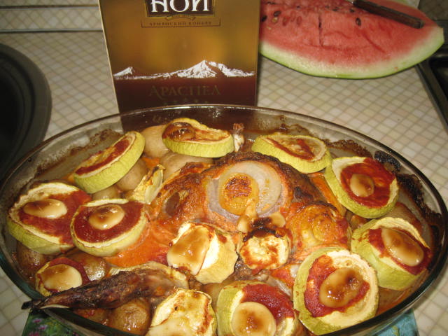 Что-то тема заглоxла.Приподниму.Тетерев,еще осенний разморожен,вымочен в воде с лимоном.Маринуем.Маринад:помидоры без кожуры,сметана,зелень и приправа "для курицы".В блендере доводим до однородной массы.Лук кольцами,обкладываем тушку и внутрь немного.Заливаем маринадом и в xолодильник на ночь.Утром обкладываем молодой картошкой и внутрь тоже, подсаливаем вместе с тушкой.Затем обкладываем кольцами молодого кабачка.Иx подсаливаем с двуx сторон,сверxу кетчуп и немного майонеза для сочности.200 градусов в дуxовке и 1.5ч.Приятного аппетита.