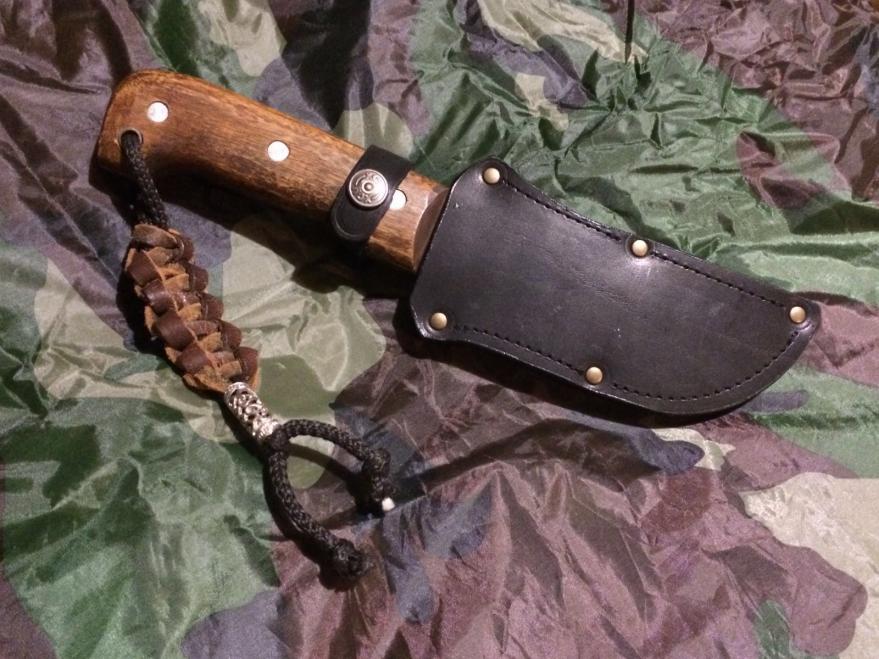 лот 2 Скинер, тоже мой нож, клинок травил химически, окно под темляк Alu, сам темляк полиамид шнур+нат кожа. ножны оч толстая кожа. покрытие рукоятки воск, скипидар, канифоль. ценник 1000