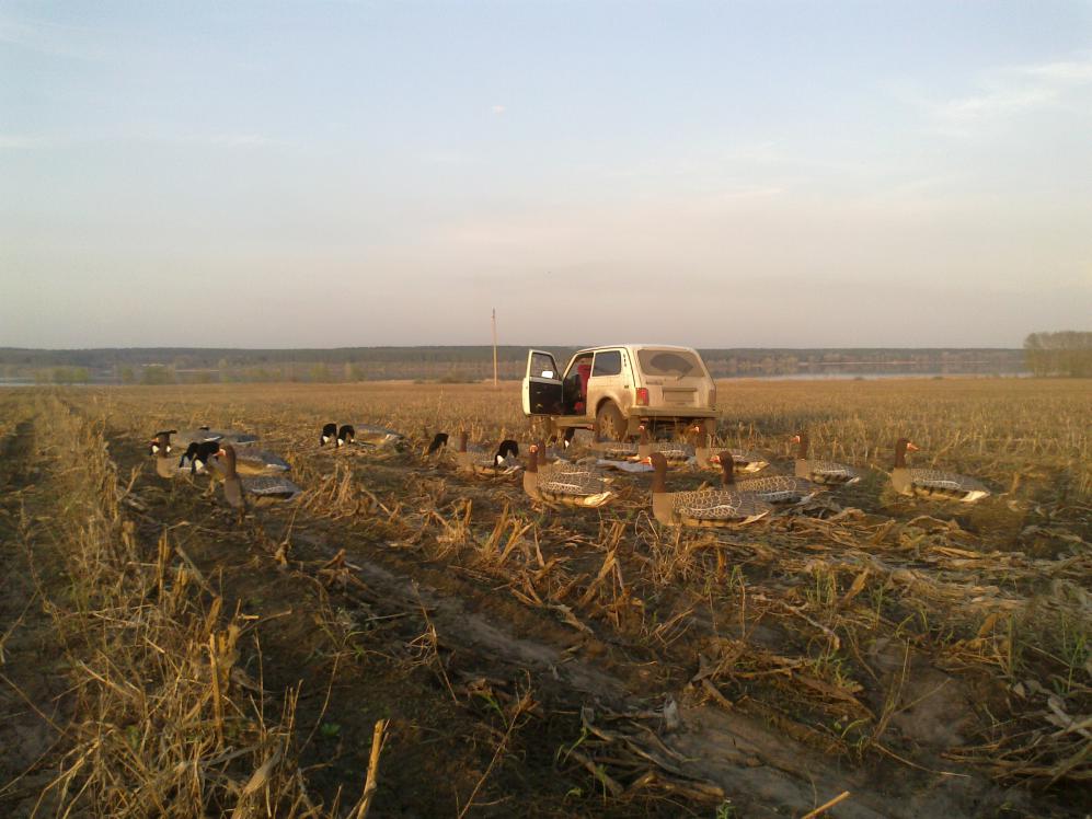 вернулись ни с чем( еще раз в голове выстроилась последовательность: разведка-маскировка (КА-ПАЙ!!!) с расстановкой чучел-и только потом стакан за встречу и прочие поводы. Только так и в такой последовательности. иначе удачи не видать. Друзья ездили туда где было для них разведано, расставлено и выкопано. Добыли 32 шт. |