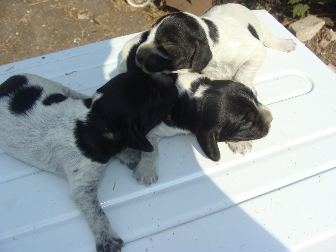 Щенки появились 12.07.2016 года. Два кобелька, одна сучка. Окрас у всех черно - пегий в крапе. В продаже к 12.08.2016 г., один кобель и одна сука.