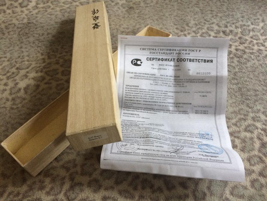 Продам нож с фиксированным клинком (уже снятый с производства) G.Sakai, Bosen Enkuto S.P. Состояние полочник, т.е. совсем не использовался. Сталь SLD (SKD-11 / Laminated SUS-405) 3 слоя. Твёрдость 63. Общая длина 34,5. Длина клинка 21,5. Толщина обуха 5. Сечение клинка - Convex Grind. Метериал рукояти — бук. Ножны: дерево чёрный бук, латунь, кожа. Коробка и сертификат в наличии. Резервы на сутки, потом опять в продаже. Цена: 17000 рублей.