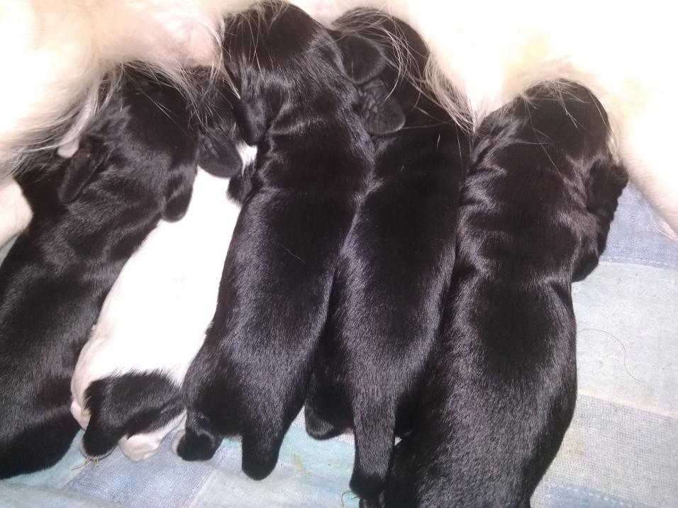 9 щенков: 6 кобелей (2 черно-пегих и 4 черных)/3 суки (черно-пегая и 2 черных)