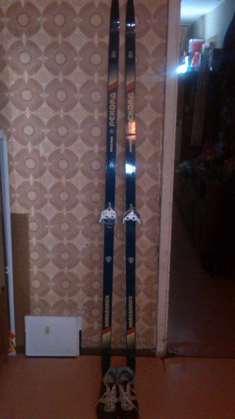 Лыжи (200см) дерево-пластик, с ботинками 45 размера, палки алюм 130см, 300р за всё