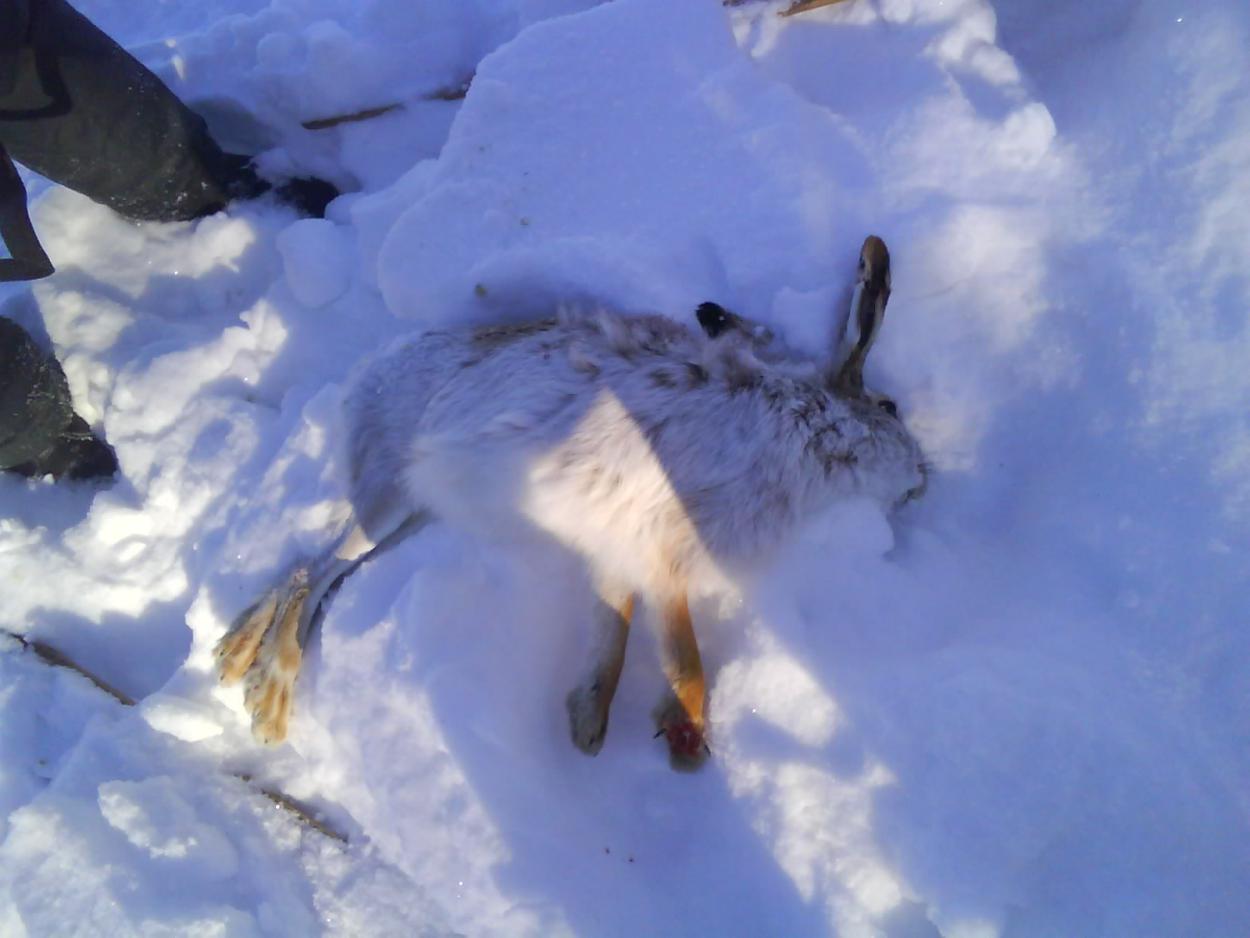 Сегодня закрыли сезон в Домашкинском ох.х. со счётом один заяц на четверых за сезон. Заяц получился трудовой, подняли и стреляли около машины, а потом 15 км торопили подранка. Заяц оказался уже стреляный, уши как решито, но это видимо еше по осени, раны уже зажили.