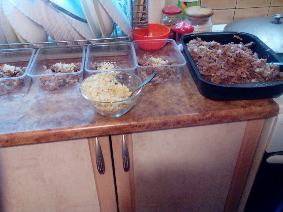5. Мясо не кручу, а разбираю вилками. Распределяю на дно пары судков, сверху варенная морковка кружочками-цвяточками, выправляю на соль, И ЧЕСНОЧКА ДАВЛЕННОГО от души! Заливаю бульоном и на балкон (не на мороз! в прохладу!). Мой холодец застывает через 2-3 часа!