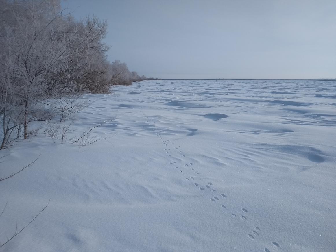 Утеплился, нацепил обмундирование, лыжи, ружье и пополз по снегу. Снега в полях очень много,давно такого не было. Когда случались падения(куда без них), проваливался местами по самые помидоры и потом барахтался как жук т.к. твердой опоры нет. След зайца был у села и в сторону села, в селе искать не стал, пошел против следа, так для ориентира и ознакомления. Зай шел ровно в село вдоль оврага с небольшими петлями и играми.