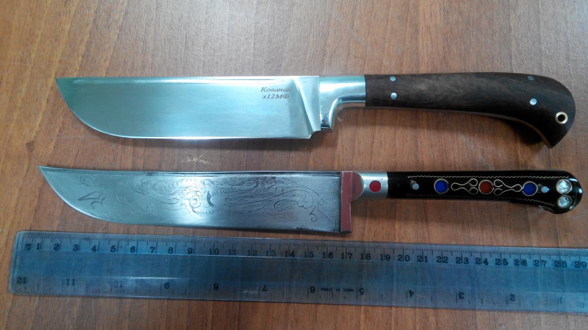 Ширина тоже имеет значение - при той же толщине угол сведения меньше на широком ноже. Ну и до обуха дальше. Но что мне не понравилось, так это прилипание срезанного продукта к плоскости широкого ножа. Да так прилипает иногда, что и не сдвинешь. Вот тебе и пчак. Пробовал - не понравилось. Кончик ножа национального пчака приподнят - не удобно нарезанный продукт с доски смахивать обухом. Рукоять пчака широкая в горизонтальной плоскости и тонкая в вертикальной - мне ваще не удобно. У национального пчака очень мягкая сталь. Правят ее постоянно. Посему не может он быть без подводов, кроме как совсем новый.