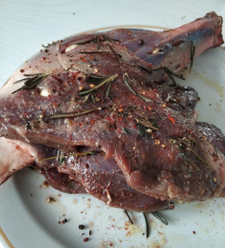 Окорок кабана! Маринад прост - нашпиговал чесноком, добавил мороженный розмарин и чабрец, перец всякий, соль и с верху масло оливковое, натер... пленкой пищевой закрыл и в холодное место на сутки... Запекал при 200 грудусах - 1 час с накрытой фольгой, 2-й час без. периодически поливал маслом по чайной ложке... Получилось очень вкусно, рекомендую!