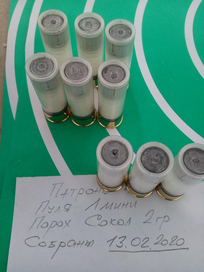 16 февраля 2020 на Вымпеле провёл контрольный отстрел самоснаряжённых патронов с пулей Люман мини. Вес пули с пыж-контейнером (Н-28) и опилками в юбке - 28 гр. Порох Сокол 2 гр. Закрутка. Ружьё ИЖ 27. Дистанция 25 метров. Патроны специально держал два часа на морозе. Вывод: 2 грамма пороха в зиму мало. Попробую сделать 2,2. На фото лучшая куча. С нижнего ствола.