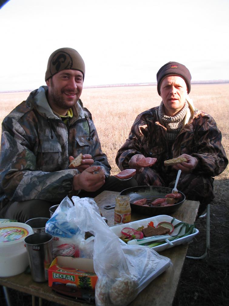 В субботу утки не было. Периодически в стороне пролетали небольшие стаи гусей, достаточно высоко. Правда один раз группа из нескольких гусей прошла низенько над расставленными профилями, но именно в этот момент все сидели вокруг костра и только пощелкали зубами.
