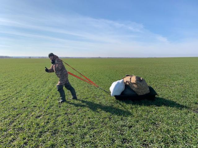 - Вес чучел – вес чучела со стойкой примерно 1,5 кг. Если заносить эти чучела на себе, то это довольно таки тяжело. Мы завозим обычно на салазках или в прицепе.