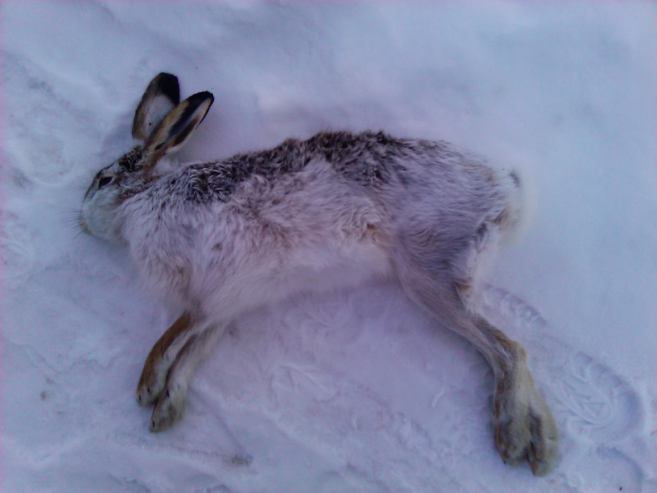 Вот и мы седня проредили популяцию косых, я мой отец и Серега 269 (ну еще наша собака, которая стерла подушечку на лапе ) прогулялись седня на славу, заяц лежал в траве, что с мой рост. Сначала я начал тропить один след, вдруг сошлись два следа, но но потом на следе снегохода они разошлись в разные стороны я как правильный пошел на право пройдя с полкилометра тут след уходит вправо, я по следу метров десять и смотрю поднялся, а в траве то снега полно, бежит медленно вообщем с третьего я его взял. Фото не ахти ( какие уж есть).