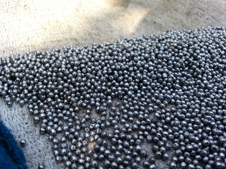 Добрый вечер! Изменил сегодня угол наклона лотка, и укоротил его.Лил сначала в масло, результат на мой взгляд стал лучше (правда со свищами не знаю как зделать так чтоб их небыло, но пустотелых дробин вроде нет.) Лил все так же с кабельного, за акумулятором сегодня утром заехать не удалось. После того как закипело и полыхнуло масло сделал треногу, теперь все пламя только на ванночку со свинцом. Теперь буду думать как сделать из подручных средств дробокатку....Лил еще в горячую воду, дробины чуть похуже чем в масло...