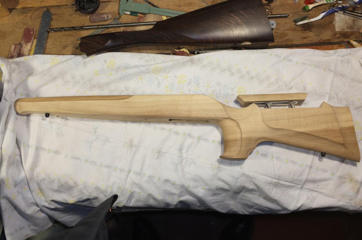 Работа хорошая, ничего не скажешь. Очень мало мастеров, понимающих что надо делать. Кто-то хорошо работает с деревом, но не понимает, какое должно быть ложе. А кто-то знает, какая должна быть ложа, но не умеет работать с деревом. Да и орех хороший найти еще та проблема. У самого уже лет десять лежит большой кусок импортного ореха, на full-stock ложу для винтовки, не могу найти мастера.