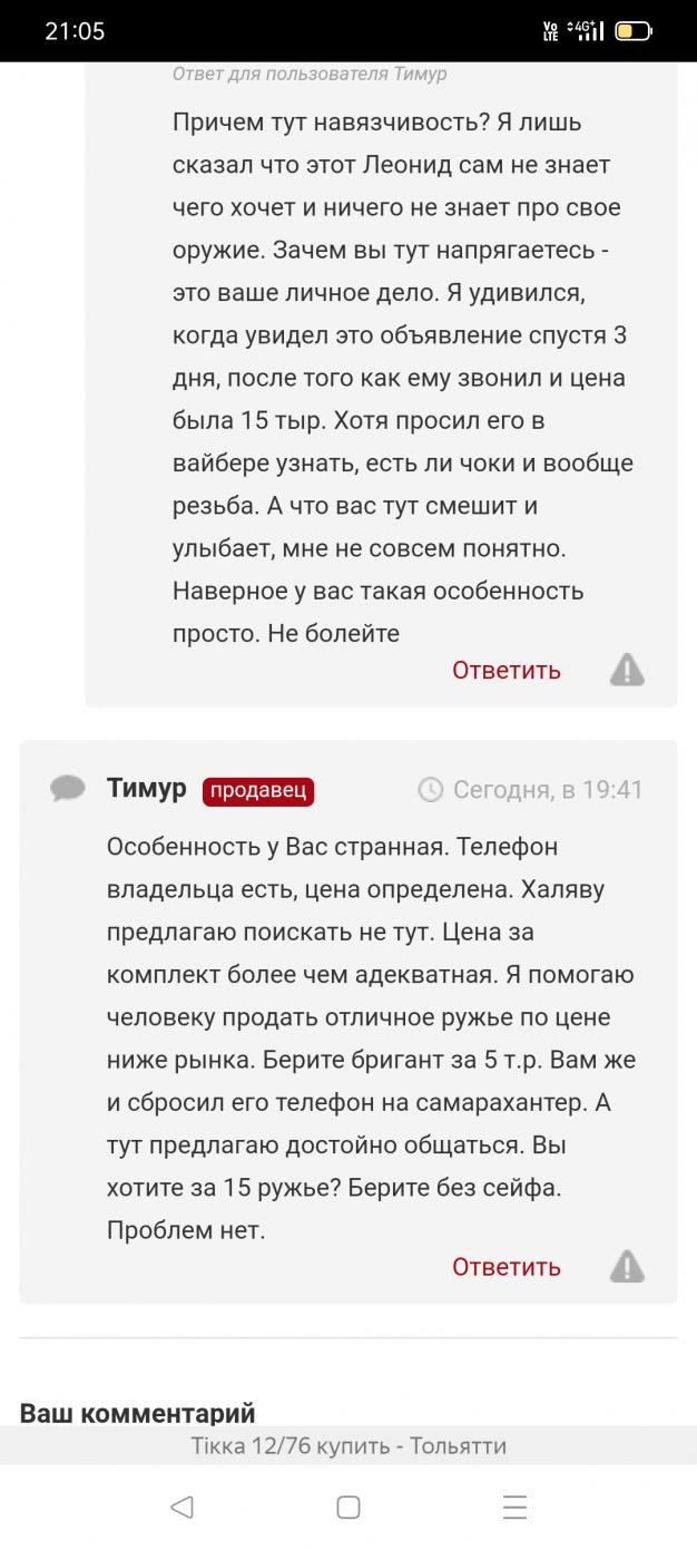 Про цену дело ВЛАДЕЛЬЦА. Не устраивает цена комплектом, берите за 15 ружье с набором для чистки. Про халяву сказл Вам ранее на ганзброкер. Цена за тикку более чем адекватная, учитывая что 20 за комплект на фото. Не делай добра, не получишь *гвна. скрины с ганзброкер прикрепил для понимания у людей Вашего настроя. Берите бригант. Удачи в покупке. |