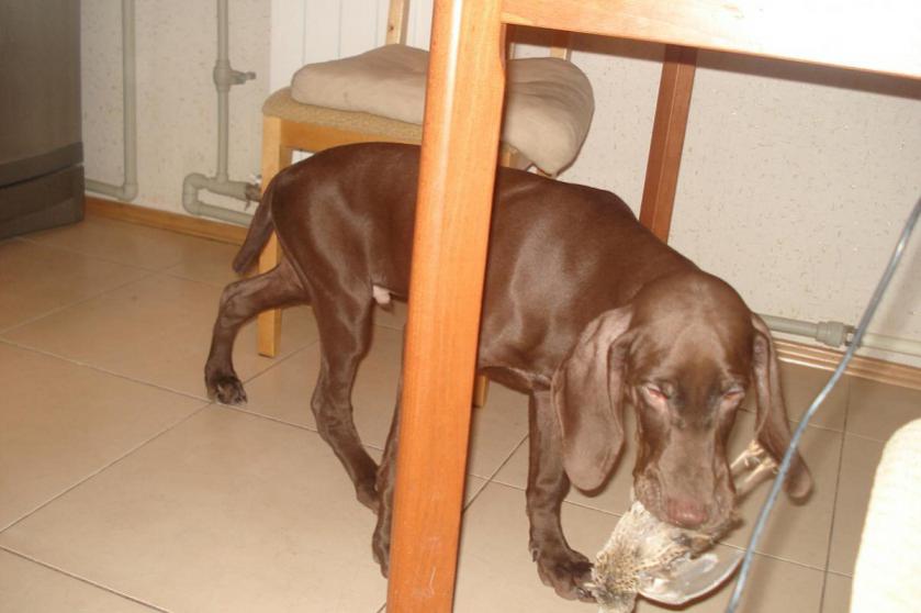 Любит проводить время в деревне, куда едем 200 км и щенок отлично ведёт себя в дороге (спит или просто валяется, при этом не справляет в машине нужду, что особенно радует ).Ко всему проявляет любопытство, особенно понравилась птичка, которую сработала его мамка. |