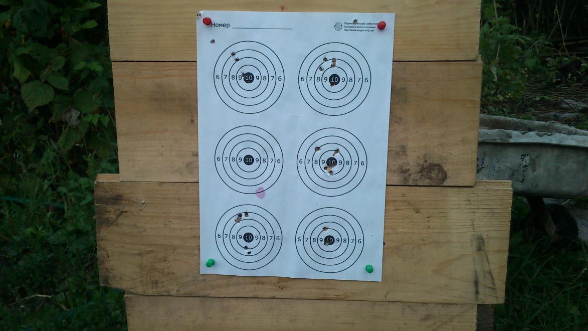 Острелял на 25 м по мишени (помоему для пистолета на 10 м)прицел 6х32.Правая нижняя на кучу,в мишени 6 пуль,один отрыв по моей вине,дернул с/к.потом поправился,в десятке 5-ть пуль.