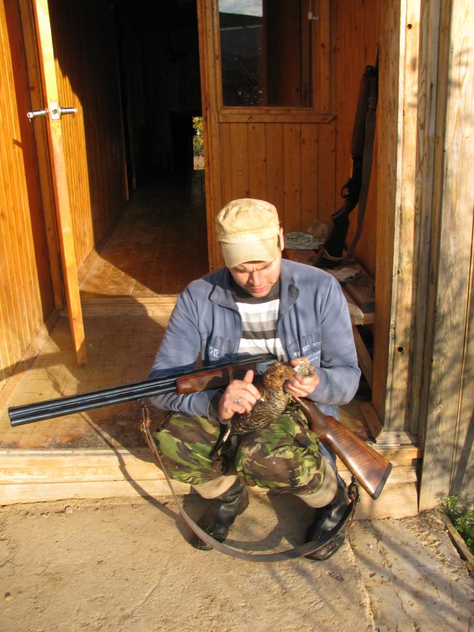 На выходных мотались в Кировскую область, на вечерку не успели!Выпили по маленькой поговорили с егерем о делах грядущих и легли спать т.к. вставать нам в 4 утра а в пути мы были 9 часов! рано утром Володька нас поднял пить не дал токма чай крепкий и прыгнули в его новую буханочку и отправились на поле... постояли послушали тишина, пошли обходить рыбные места ,прочесав 3 поля кабана не увидели, медвед тоже свалил куда-то,вообщем рассвело и мы поехали искать тетерева, мне повезло я взял со 2 выстрела с гладкого тетерку, дальше стреляли из нарезного ижевского производства с кочергой малого калибра оч классная штука, добыли петушка и все Володя на это утро нам больше не дал стрелять.поехали на базу завтракать, поели выпили малясь и завалились спать. После отдыха поехали стрелять по тарелкам пристрелить новое ружье товарища по охоте . Постреляв и отобедов у гостеприимного хозяина шашлыком из кабанчика охотбазы и получив хороший урок по стрельбе (т.к. он является чемпионом России по стрельбе) начали готовится к заезду на вышки, мне дали гладкий Бекас с Белорусским ночником, товарищу достался Блейзер с охрен. ночоптикой, и поехали мы каждый на свою вышку. При подъезде на нас выскочил лось здоровый бык в зоне выстрела он был больше 1 минуты, но егерь сказал что мы раньше времени не стреляем... посмотрев на этого красавца мы доехали до дороги ведущяя к засидки.