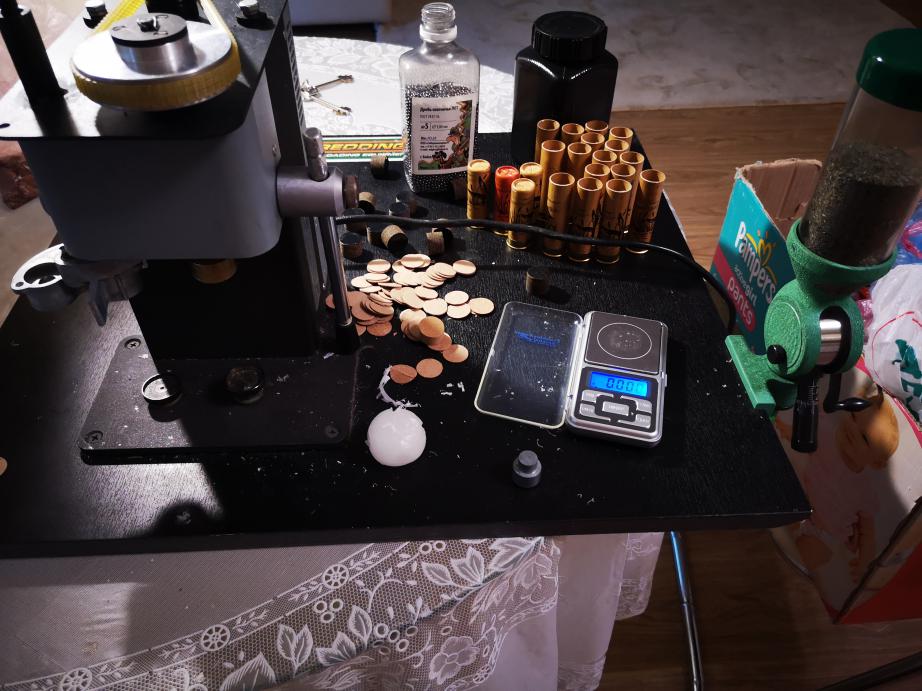 В голову пришла мысль использовать малярный скотч, а точнее я ее уже реализовал. Маток скотча разрезал, получилась полоска. Пыжерезом высек три пыжа для пробы, далее начал наклеивать "наклейки" на донце гильзы и затем все это дело промаркировал шариковой ручкой. Получилось не плохо.