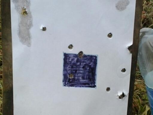 Мишень, сторона черного квадрата 5 см. Три выстрела по квадрату, два попадания в квадрат, одно рядом. Остальные отверстия пристрелочные. СОК-95, ствол 420 мм, калибр 308. Перед покупкой промерил калибрами, 7,63 с патронника заходит, 7,62 с дульного среза еле-еле залазит. Короче ствол с напором.