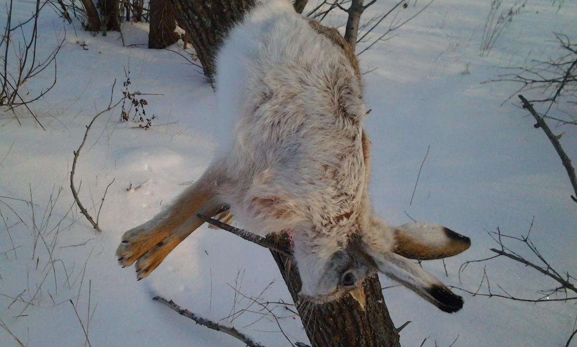 Сегодня денек удался.Но это потом я так подумал.С 8:30 нашел следик и понеслась...Километров х.. знает скока.Все истоптано до асфальта.Везде.Вытропил таки зая,но он рванул от меня через посадку.Стрелять пришлось через деревья и кусты да и далековато...Но ушел не останавливаясь.Посмотрел на след-заряд прошел по следу,а крови нет.Метров 100 прошел-гонный и не кровит.1:0 в пользу зая (подумал я).Бросил его,пошел искать других,но через час вернулся-интересно где он пробежал.И вот он,красава.Я когда по следу шел-не дошел 10 м до него.Оказалось 1:0 в пользу меня.