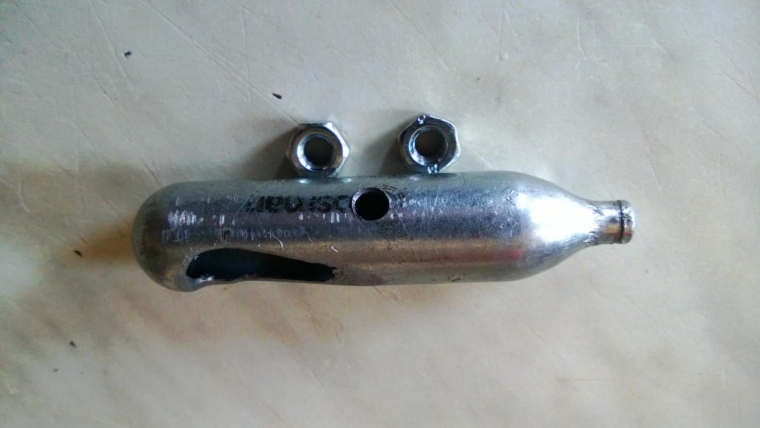 В боку баллончика просверлил отверстие сверлом 4,5 и нарезал резьбу М6. Напильником пропилил дыру для зачёрпывания свинца.