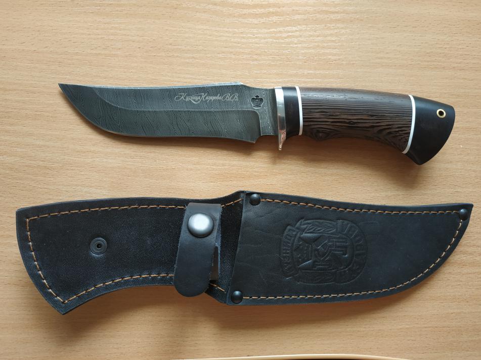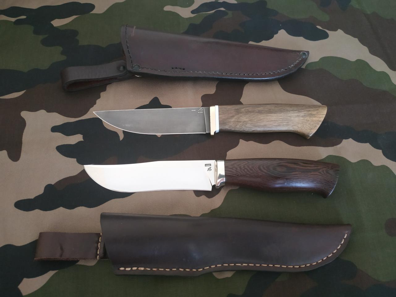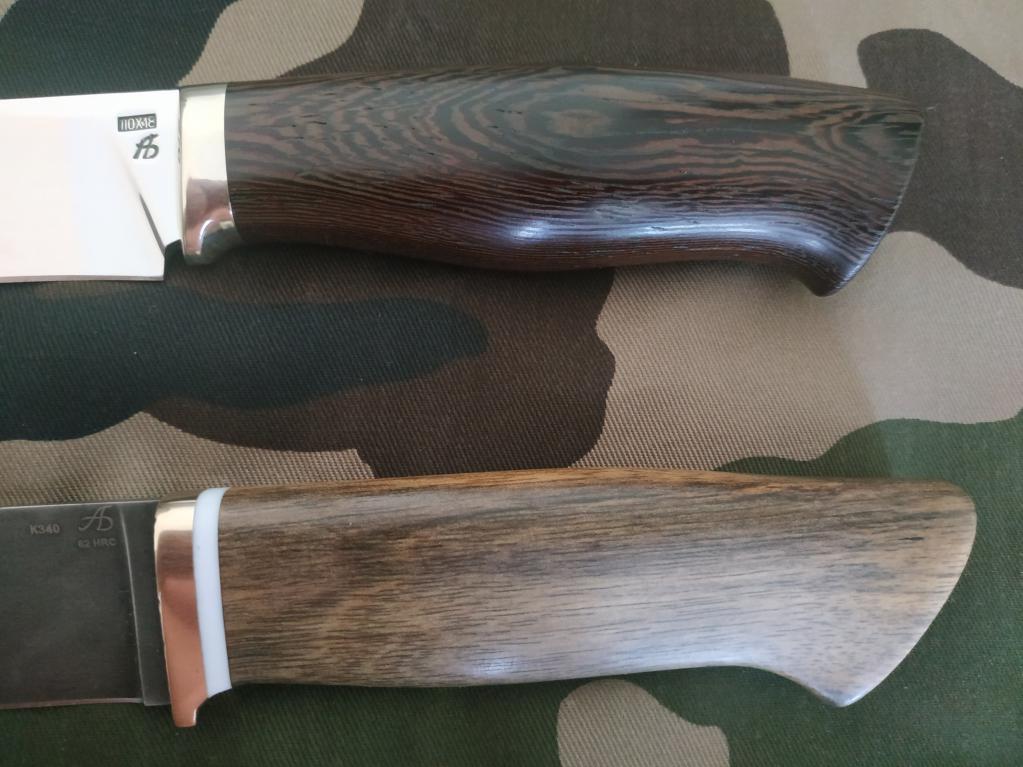 1.Нож Мангуст из дамаска кузница Назарова.Дамаск — это высокоуглеродистая сталь, с содержанием углерода до 1,3%, обладающая превосходными характеристиками, нередко приближающимися к свойствам настоящего булата. Процесс изготовления дамасской стали известен и достаточно прост в разговорах и на бумаге, но кузнецов, кто изготавливает дамаск с феноменальными свойствами очень мало. И весь секрет дамаска — именно в кузнице, и не каждый «нож из дамаска» обладает теми качествами, которые присущи этому металлу Суть получения сварочного дамаска такова: собирается пакет из разносортного металла с различным содержанием углерода, посыпается флюсом, нагревается в горне и куется, по мере вытяжки брусок разрезается поперек, опять складывается в пакет и операция повторяется, и так несколько раз. Число слоев может доходить в итоге до десятков тысяч, но оптимальным, на наш взгляд является число примерно в триста слоев. 4900р. 2.Нож Нерпа из подшипниковой стали 110Х18 кузница А.Бирюкова.Нож и ножны изготовлены на заказ .Что из себя представляет сталь 110х18? Как и другие виды стали, марка 110х18 представляет собой сплав железа с углеродом. При этом она относится к категории нержавеющих, поэтому изначально использовалась для изготовления хирургических инструментов и подшипников специального назначения. Также такой материал называют еще и «ножевым», потому что именно из него делается большое количество холодного оружия самого разного назначения. Причина подобной популярности кроется в том, что в таком составе процент содержания углерода очень низкий (всего 1,05%) и практически не наблюдаются вредные примеси. Основным же элементом в данном случае является хром, что повышает полезные характеристики, в особенности прочность, износостойкость и т.д. Цена 6500р. 3.нож из австрийской стали К340 кузница А.Бирюкова.Изготовлен на заказ.К340 – холодноштамповая инструментальная сталь фирмы Böhler (Австрия), полученная методом электрошлакового переплава ЭШП. Технология ее производства защищена патентом BOHLER K340 ISODUR®. Область применения: режущий инструмент (матрицы и пуансоны), пробивной и вырубной инструмент. Холодноштамповый инструмент для волочения, глубокого волочения и вытяжки, чеканный инструмент, инструмент для гибки, инструмент для накатки резьбы. Отрезные лезвия, измерительный инструмент. Сталь К340 — это аналог известной штамповочной стали Х12МФ. По характеристикам превосходит стали AISI A2, S7, D2. При изготовлении используется технология электрошлакового переплава, за счет этого в стали содержится минимальное количество примесей, что значительно улучшает её свойства. Отличается очень хорошим резом и хорошо держит режущую кромку. Однако, в отличие от Х12МФ, она еще меньше подвержена коррозии и приближается к нержавеющим сталям за счет добавления молибдена и ванадия и чуть меньшего содержания углерода, чем в Х12МФ. Сталь также содержит редкоземельные металлы - ниобий. Благодаря своему химическому составу сталь обладает более однородным распределением карбидов. Карбиды мельче, чем в составе сталей с 12-процентным содержанием хрома. Химический состав стали К340 в %: C Si Mn Cr Mo V Nb, Al 1,1 0,9 0,4 8,3 2,1 0,5 + Преимущества: Очень высокая твердость. Высокая износостойкость. Высокая ударная вязкость и пластичность, обеспечивающая широкий спектр областей применения. Улучшенная обраба
