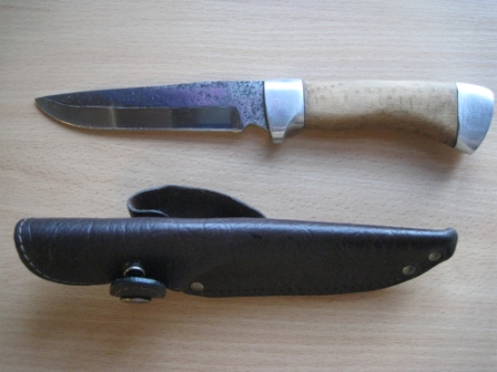 Нож изготавливался на заказ по моему эскизу.Клинок дополнительно 5 раз ковался,ножны заводские-кожа.Ручка дерево,пропитанное шафтолом.Б/у 1 сезон.Цена 1.2т.р т.89372ноль33407