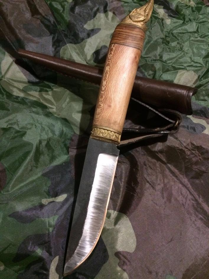 Лот 1 нож моего изготовления. Единственный экземпляр, ручная работа.клинок кованая сталь Х12МФ, клики этой партии бились честных 61Ровелл. рукоятка кавказский платан+жабры акация. литье щука латунь. Всадной монтаж. Финские ножны темно коричневого цвета, сидит в них как для него и делали. При хвате за голову щуки баланс таков что можно и потопорить. В лучших традициях девственности не точился! Вы будете первым) если кому это не важно могу заточить. Отдам за 2500.. Чудный подарок на 23. Клин 130мм, общая длина 29,5. обух 5мм!