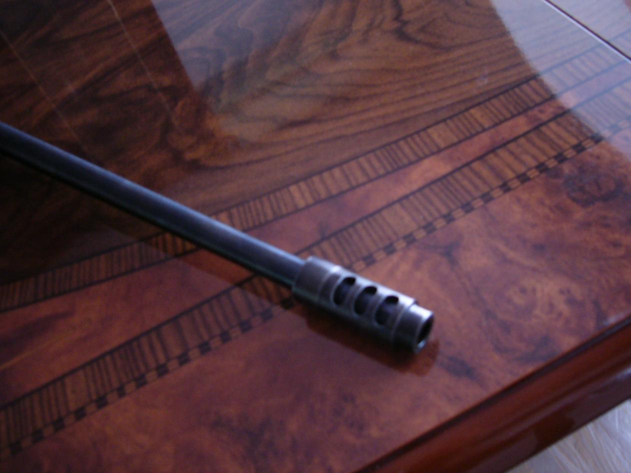 ДТК установлен без нареза на стволе, посажен в натяг , снимкется за 3 минуты, установка для эстетики, так как была снята мушка по причине чтоб не мешала, потому что стоят низкие кольца для оптики и при стрельбе чтоб щека лежала на прикладе