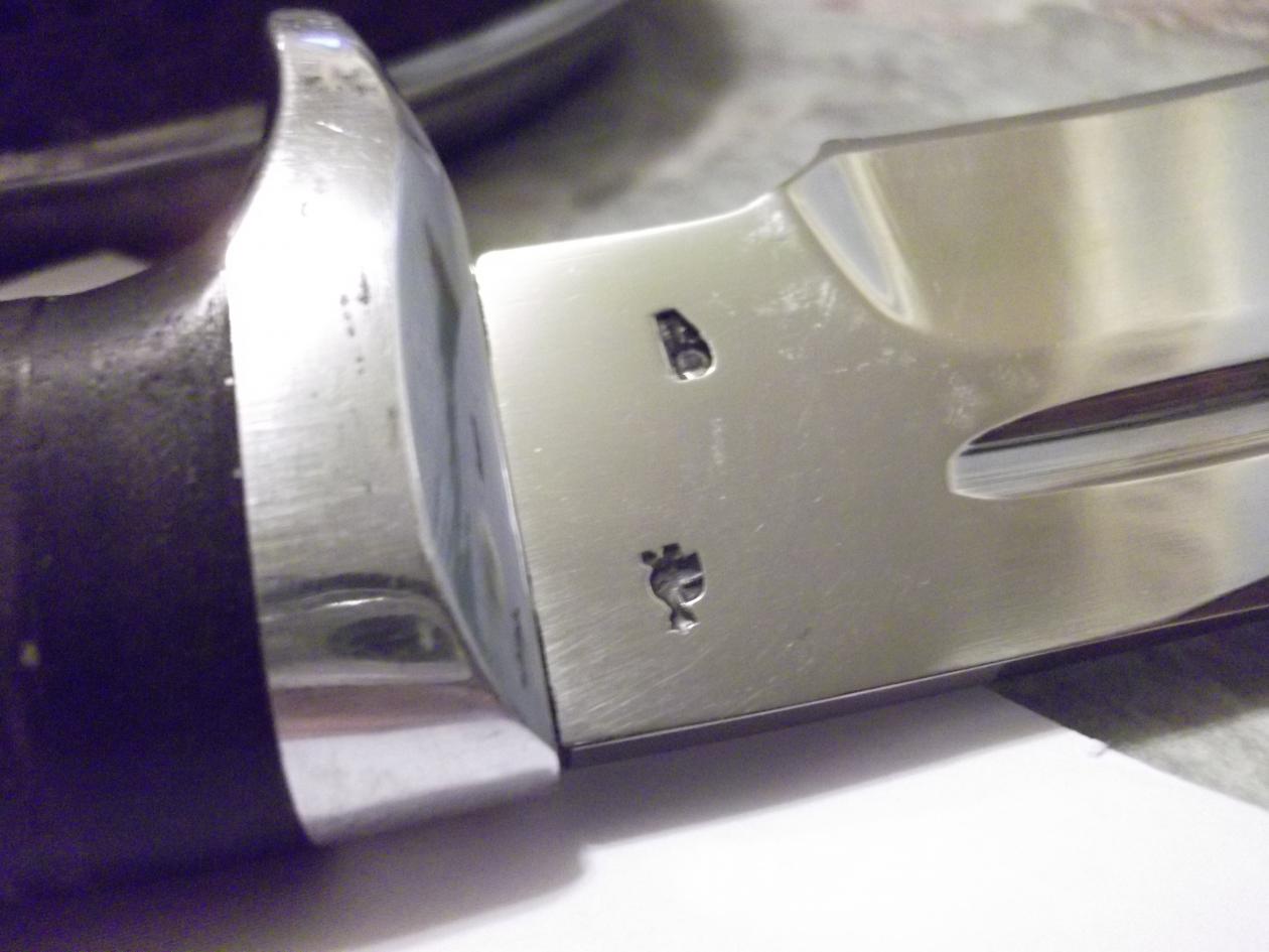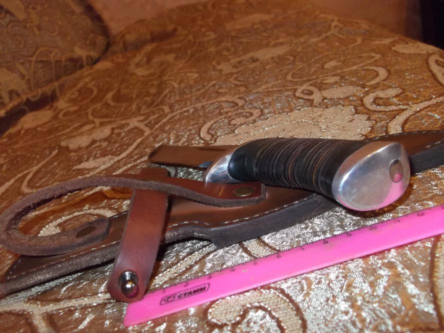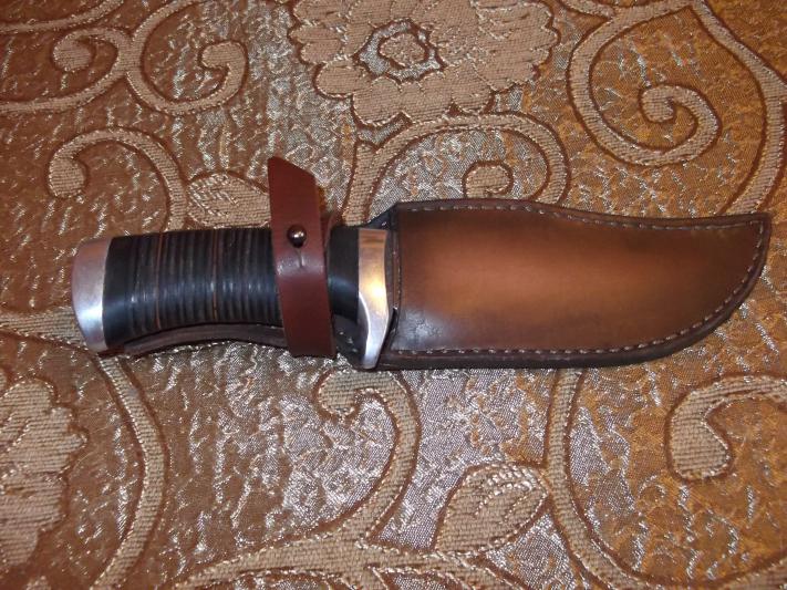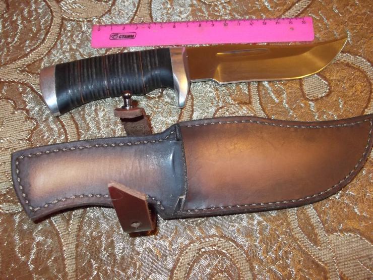 К продаже нож...ранее на форуме продавался (без ножен), к нему добавлены ножны ручной работы + заточен. Рукоять наборная кожа. Ножны сшиты вручную,специально под данный клинок (мастерская Романа Серкова). Сталь-не знаю, но точился с трудом. Мастер (клеймо на клинке), как пояснил предыдущий владелец он не помнит,но достаточно известен. Нож своеобразный, ближе к виду разделочных. Все размеры на фото. Толщина клинка от 3 до 4 мм от острия к рукояти...Причина продажи-приобретен нож (изготовлен) по заказу....